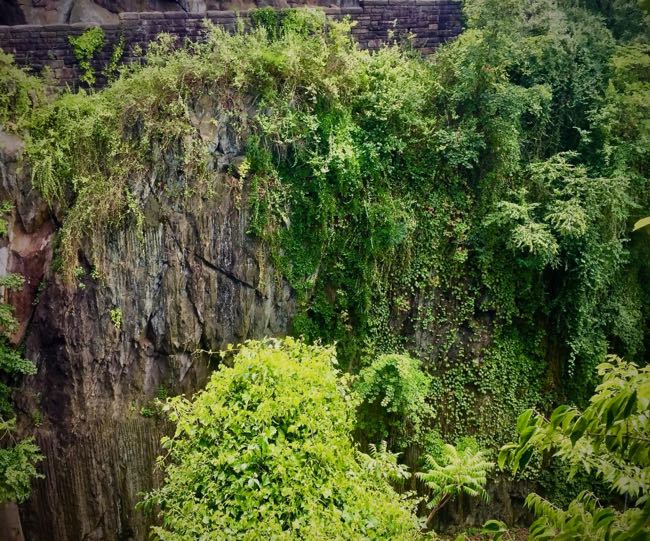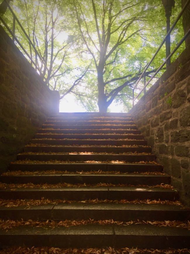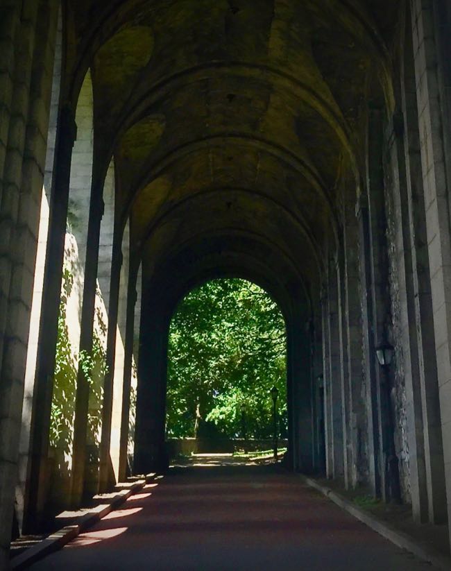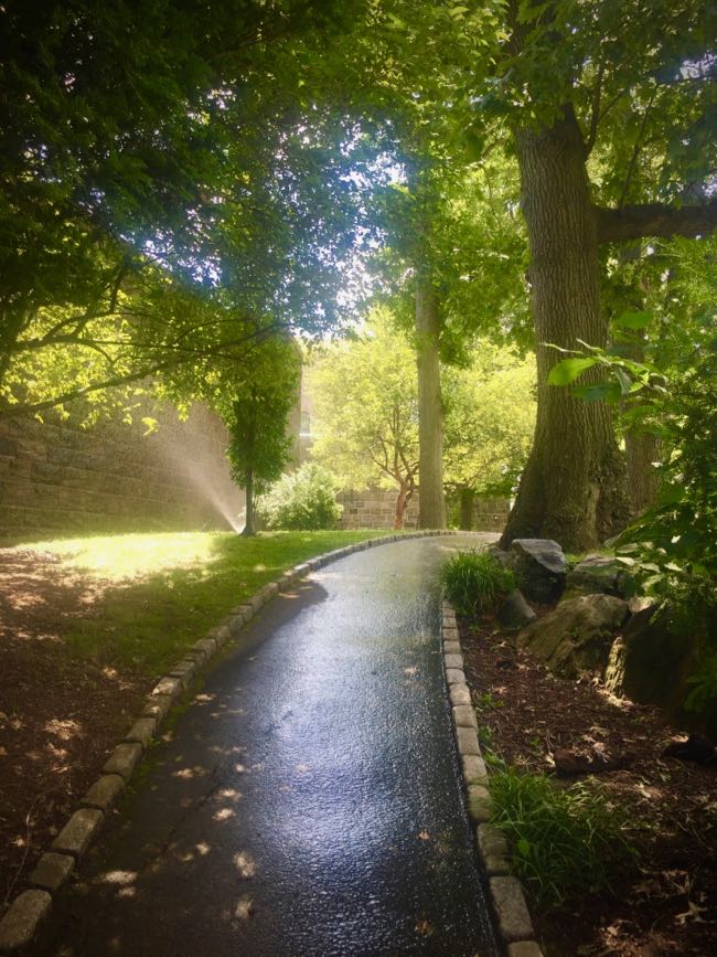 There’s also a nearby spot that, every time I pass through, I feel transported back to youth. It’s a garden area, shaded almost entirely by trees and shrubs and a museum wall, with a triangle of lightly trafficked paths connecting the rear of the museum to that cobblestone driveway out front. I have no idea how to capture it on camera.